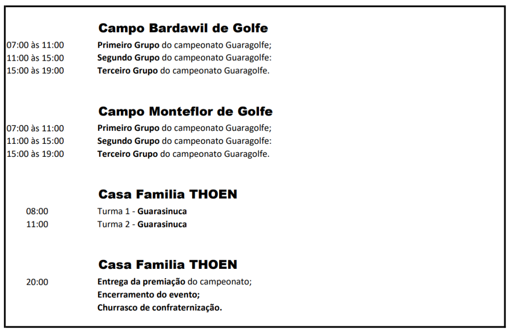 Os inscritos participarão de um sorteio com uma tabela pré-definida e será realizado no sábado com horários determinados e haverá flexibilidade se conflitar com o Golfe, nosso principal torneio.